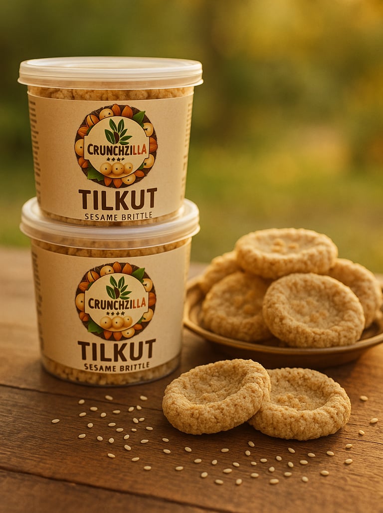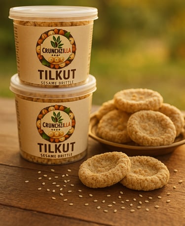 Experience the irresistible taste of CrunchZilla Tilkut, a timeless delicacy crafted with sesame and available in two authentic variations. The jaggery(gud) Tilkut carries a golden-brown hue with a rich, earthy sweetness that feels wholesome and nourishing, while the sugar Tilkut shines in soft white, offering a lighter, smoother flavor that melts effortlessly. Each piece is perfectly rounded with a crisp texture and a nutty balance of sweetness and crunch, presented in a convenient resealable tub for lasting freshness. Ideal with morning tea, afternoon coffee, or as a satisfying treat on the go, CrunchZilla Tilkut makes every moment a little more special. Each tub contains approximately 250g of this nutritious, traditional indulgence.